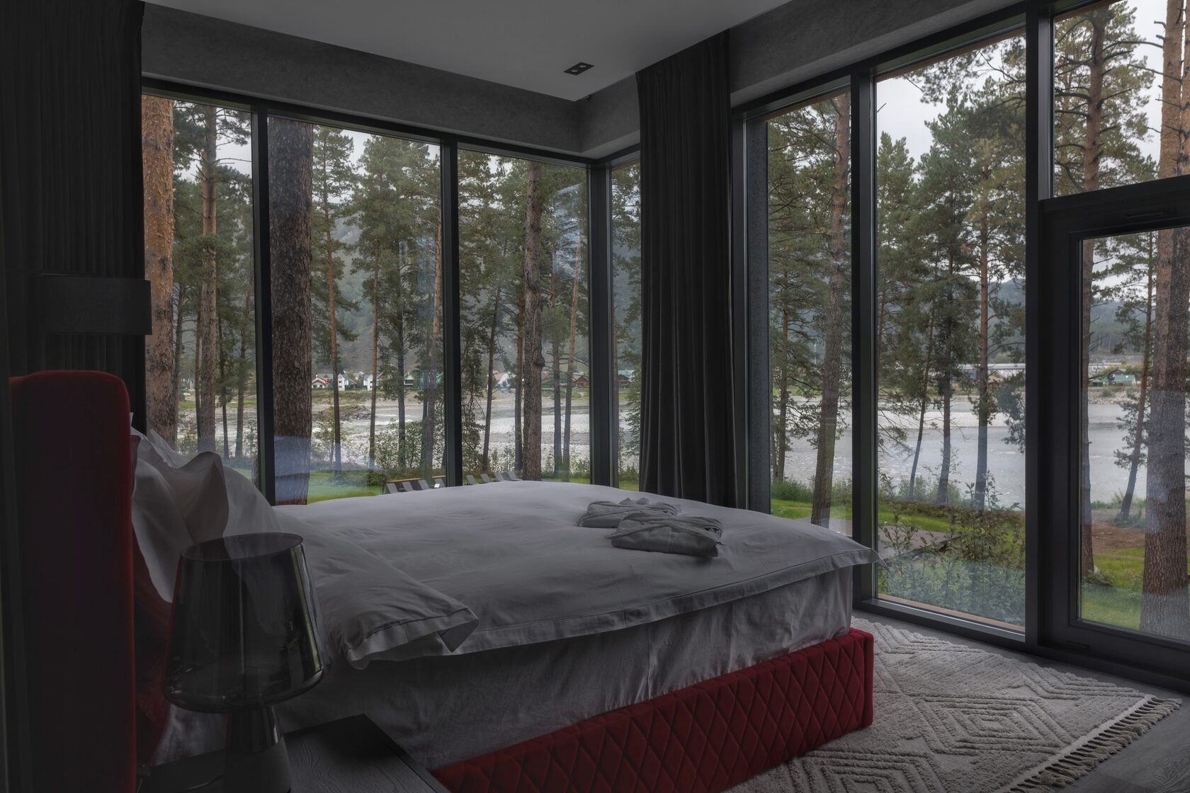 Территория занимает шесть гектаров. Для леса немного, для уединения достаточно. Дома расположены так, что гости не смотрят друг другу в окна. Панорамные стекла открывают вид на Катунь и горные хребты, а не на соседние террасы.
